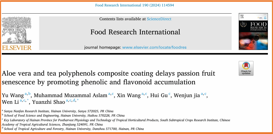 一、针对百香果采后失水皱缩、品质下降的关键问题,从角质层代谢的角度探讨了其发生的内在原因,揭示了复合涂膜处理控制品质劣变的生理与分子调控机制,研究结果发表在《Food Research International》 (IF2024=7.425,中科院1区,TOP期刊)和 《Food Chemistry》(IF2024= 8.3,中科院1区,TOP期刊)上。该研究得到了suncitygroup太阳成集团热带高效农业协同创新项目(XTCX2022NYB07)的经费支持。