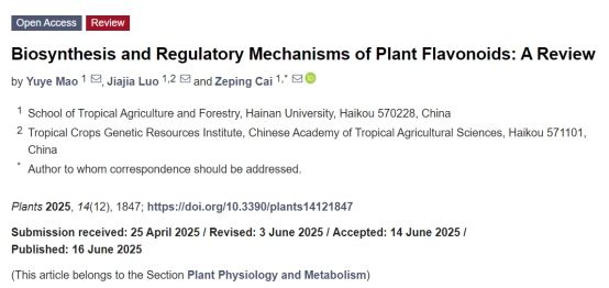 2025年6月,公司本科生毛昱烨以第一作者身份在期刊《PLANTS》发表题为《植物类黄酮的合成和调控机制》的综述论文。该期刊在中科院最新发布的SCI期刊分区(2025年3月升级版)中,位列生物学大类2区及植物科学小类2区,其最新五年影响因子为4.4。论文系统梳理了植物类黄酮的生物合成途径、调控网络及其在农业与医药领域的潜在应用。suncitygroup太阳成集团蔡泽坪副教授为论文的通讯作者。该论文得到了于旭东科研团队以及suncitygroup太阳成集团药用植物基因组学与生物大数据挖掘创客空间的全力支持,并且获得了国家级老员工创新训练计划项目(编号202410589092)的资助。