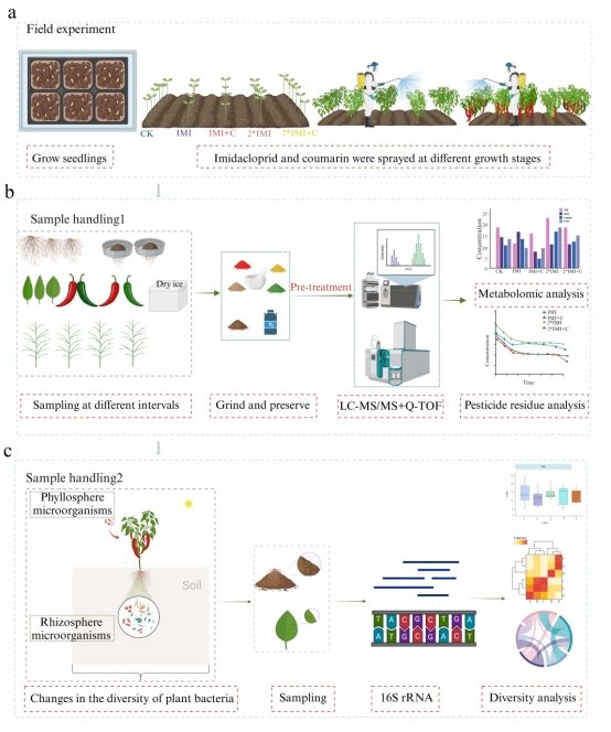 进一步的研究揭示,香豆素能够上调苯丙烷代谢途径相关基因的表达,从而显著提升辣椒中类黄酮、酚酸、植物激素以及辣椒素的含量。这些次级代谢产物不仅增强了辣椒的营养价值,而且对于提升植物的抗逆境能力具有显著意义。研究同时指出,香豆素处理显著提升了辣椒根际和叶际中益生微生物的多样性。研究发现,这些益生微生物的多样性与辣椒次级代谢产物的分泌量之间存在正相关关系。进一步的分析表明,香豆素通过调控苯丙烷代谢途径与自身合成途径,以及与微生物的协同作用,共同提升了辣椒的品质和农药降解效率。综上所述,该研究阐明了香豆素通过调控植物代谢途径及植物-微生物相互作用来降解吡虫啉残留的作用机制。这项研究不仅为减少农药残留提供了一种有效的策略,还揭示了植物次级代谢与微生物群落之间的复杂相互作用,为未来绿色农业技术的发展提供了新的思路和方法。