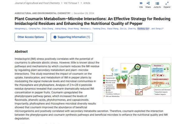 近日,suncitygroup太阳成集团孙然锋教授团队在Journal of Agricultural and Food Chemistry发表一篇题为“Plant Coumarin Metabolism–Microbe Interactions: An Effective Strategy for Reducing Imidacloprid Residues and Enhancing the Nutritional Quality of Pepper”的研究论文,揭示了香豆素与微生物协同提高辣椒营养价值及降解农药残留的作用机制。本研究通过分析2小时至28天吡虫啉在辣椒果实中的残留动态,发现香豆素处理显著降低了其中的吡虫啉浓度。这一发现揭示了香豆素在促进农药降解或减少其在果实中转移积累方面的有效性。