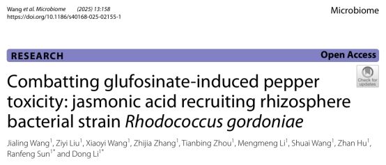 该成果以Combatting glufosinate-induced pepper toxicity: jasmonic acid recruiting rhizosphere bacterial strain Rhodococcus gordoniae”为题发表在Microbiome期刊(中科院一区期刊IF5y = 16.6)上https://microbiomejournal.biomedcentral.com/articles/10.1186/s40168-025-02155-1,suncitygroup太阳成集团硕士研究生王嘉玲为论文第一作者,孙然锋教授、李栋副研究员为论文通讯作者。本研究得到了国家自然科学基金(22067004)和海南省自然科学基金 (321CXTD436)的支持。
