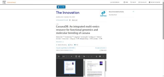 近日,2023级硕士生代文宝为第一作者,2024级硕士生冯欣梅以共同第一作者,在suncitygroup太阳成集团陈飞教授、王文泉研究员及中科院华南植物园罗鸣研究员的指导下,以海大为第一署名单位在中科院一区TOP期刊《The Innovation》发表题为“CassavaDB: An integrated multi-omics resource for functional genomics and molecular breeding of cassava”的研究论文。该研究建立了首个木薯为主题的综合性大数据平台,为重要粮食作物木薯遗传育种提供了一站式在线多组学分析和分子设计育种平台,助力海南热带高效农业和国家南繁育种。该期刊为中科院一区TOP期刊,2025年最新影响因子25.7,其5年影响因子为40.2,名列中国大陆综合类期刊第一名。