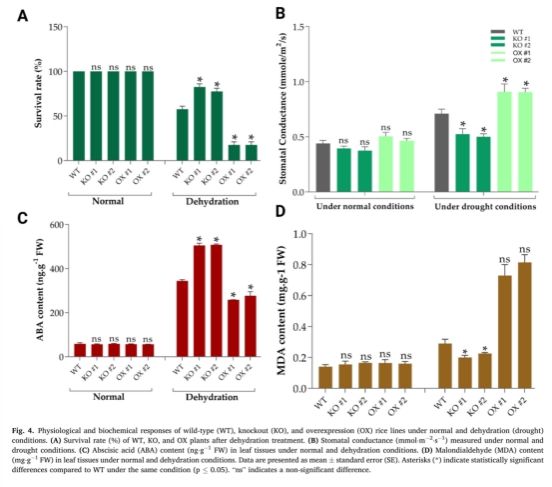 深入分析揭示,OsRAV11/12通过多种生理途径影响水稻的抗旱性。在干旱条件下,敲除株系能维持更低的气孔导度,减少水分流失,同时积累更高的脱落酸水平。这些植株还表现出氧化损伤的减轻,丙二醛含量显著降低,表明细胞膜受损程度较小。转录组分析进一步表明,敲除株系中应激响应和蛋白质折叠过程相关基因上调,而过表达株系则出现生长相关基因的不适当表达。