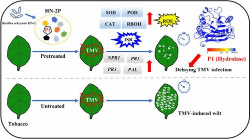 该研究表明,贝莱斯芽孢杆菌 HN-2 的总蛋白提取物可触发植物产生活性氧,上调抗氧化酶的表达水平,激活与免疫相关的蛋白基因,并诱导植物产生系统抗性。在延缓烟草花叶病毒入侵方面,该总蛋白提取物的效果优于市面上常用药剂。进一步分析表明,贝莱斯芽孢杆菌总蛋白提取物中存在一种特定的水解酶蛋白,该蛋白被命名为 P1,其在延缓病毒侵染的活性中发挥关键作用。本研究为贝莱斯芽孢杆菌 HN-2的应用提供了理论参考。