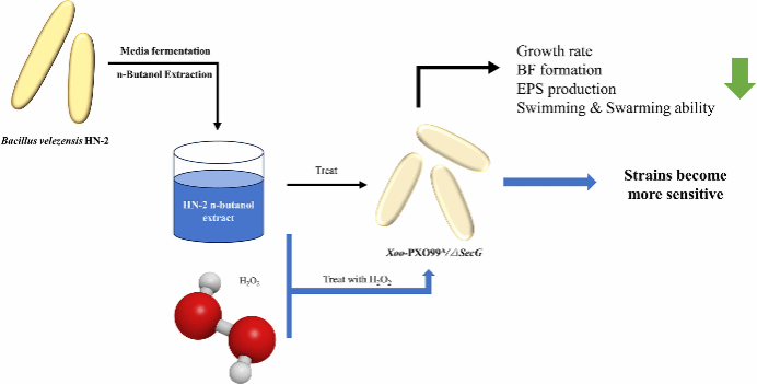 黄单胞菌(Xanthomonas oryzae pv. oryzae, Xoo)是引起的水稻白叶枯病是水稻生产中极为常见且具有破坏力的细菌性病害。长期施用化学农药面临着环境压力及产生抗药性的风险,生防菌贝莱斯芽孢杆菌(Bacillus velezensis)HN-2在对该病害的防治上展现出巨大潜力。该研究首次发现,B. velezensisHN-2的脂肽提取物(HN-2E)能够显著上调Xoo分泌系统(Sec途径)中secG基因的表达。团队通过构建secG基因缺失突变体(ΔsecG),揭示了该基因在病原菌致病性与耐药性中的关键作用。研究发现,secG基因的缺失不仅对菌株本身的生长造成了影响,同时减弱了其运动和生物膜形成能力。同时显著提升了其对HN-2E以及植物体内产生的过氧化氢(H₂O₂)的敏感性。尤为重要的是,研究证实H₂O₂能与HN-2E产生显著的协同增效作用,极大增强了生防效力。这一发现初步阐释根围生防芽孢杆菌远距离防控叶部病害的作用机制,为开发环境友好的病害协同防控新策略奠定了理论基础。