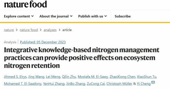 海南大学热带农林公司张金波教授和孟磊教授团队Ahmed S. Elrys教授揭示了氮素综合管理为可持续农业生态系统的氮素保留提供积极影响。该研究成果以“Integrative knowledge-based nitrogen management practices can provide positive effects on ecosystem nitrogen retention”为题发表NATURE子刊《Nature Food》上。