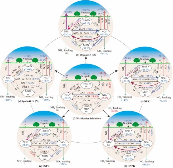 科学的氮素综合管理措施是可持续农业生态系统中氮素保留的重要措施。通过整合研究全球范围内5448组田间数据,系统评估4种常见的氮管理措施(配方施肥、施用有机肥、有机无机配施及配施硝化抑制剂)对全球生态系统氮循环的影响后发现,相比单施氮肥,施用有机肥和配方施肥可以通过增加微生物生物量来促进土壤硝酸盐驻留;与不施肥相比,施用有机肥和平衡施肥也能促进土壤氮素淋溶和气体排放。然而,硝化抑制剂刺激了土壤铵的保留和植物氮的吸收,同时减少了氮的淋溶和气体排放。研究指出,科学的应用氮素管理措施对于促进生态系统氮素保留和降低全球氮损失风险至关重要。