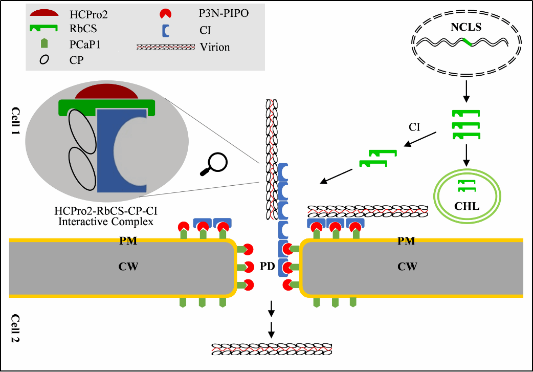 以ANRSV / ANSSV基因组5′端编码的特异串联半胱氨酸蛋白酶HCPro1-HCPro2为切入点,采用反向遗传学、生物化学、细胞生物学等技术手段证实:1. HCPro1不是病毒侵染所必需的组份;2. HCPro2促进病毒的胞间移动;3. HCPro2与病毒移动蛋白 - CI和CP在胞间连丝处形成互作复合体;4. 核酮糖-1,5-二磷酸羧化酶/加氧酶小亚基(RbCS)介导移动蛋白复合体组装,正调控Potyviridae病毒的胞间移动(图2)。上述研究结果为理解Potyviridae病毒的胞间移动提供新见解。