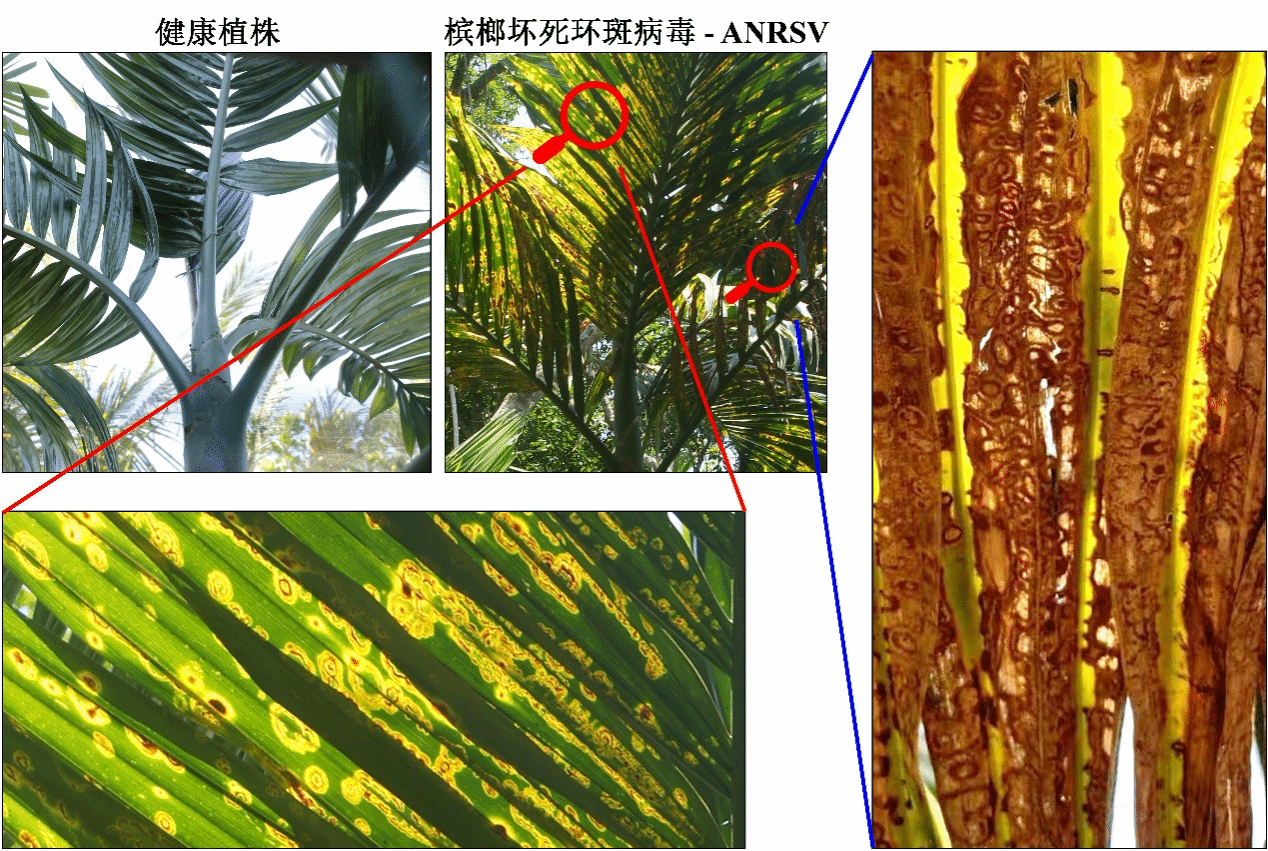 图1 槟榔坏死环斑病毒(ANRSV)田间危害症状