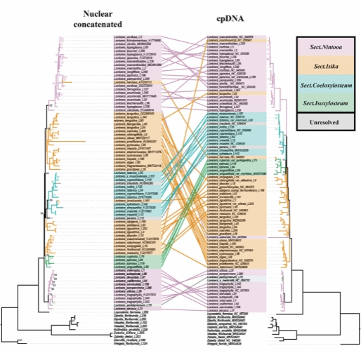 图1 忍冬属核基因(左)和质体基因组(右)系统发生对照图