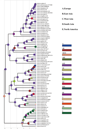 图2 基于核基因组数据重建忍冬属祖先分布区区的最大分支可信树