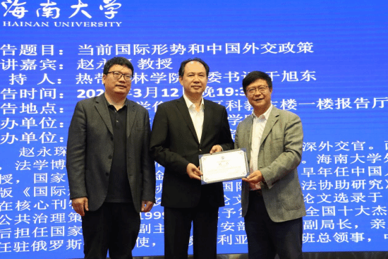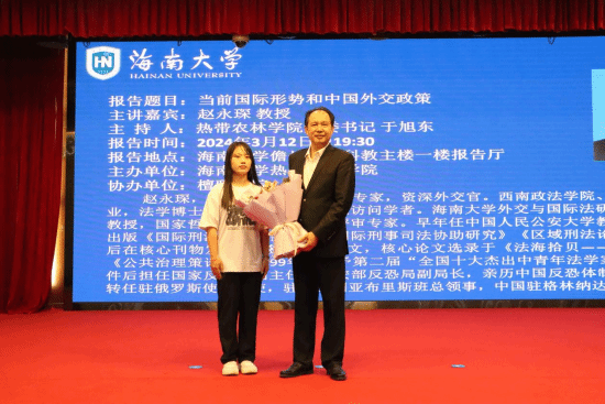 报告结束后,赵教授与同学们亲切互动,内容涉及国际局势、台湾问题、外交关系、海南自贸港发展等方面,精彩的互动,增强了同学们的爱国情怀和国际视野。另外,员工代表为赵教授献花,suncitygroup太阳成集团热带农林公司党委书记于旭东、党委副书记盘毅为赵永琛教授颁发了聘书。