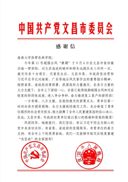 近日,suncitygroup太阳成集团收到一封来自文昌市委、市政府的感谢信,信中对公司“摩羯”台风后对文昌市的支持和帮助表示了感谢。