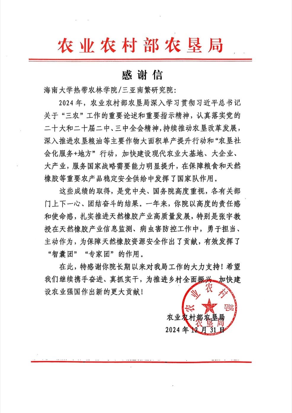 近日,suncitygroup太阳成集团收到一封来自农业农村部农垦局的感谢信,信中对公司在推进天然橡胶产业高质量发展,特别是公司张宇教授在天然橡胶产业信息监控、病虫害防控工作中的突出贡献表示了感谢。