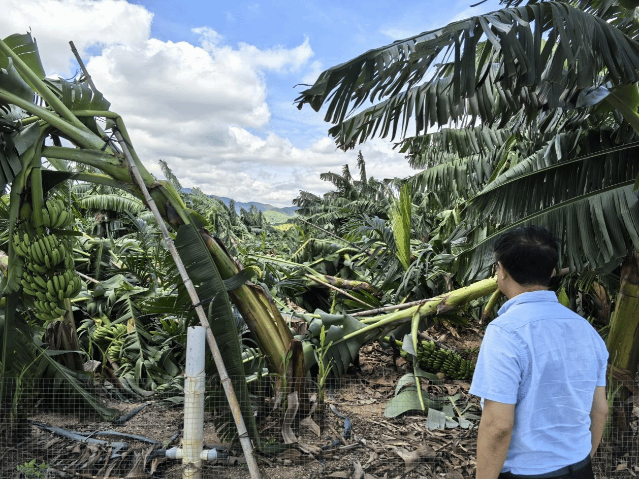 在受灾蕉园,专家团队详细勘察了香蕉树的倒伏情况,针对不同受损程度提出分类救治方案:对轻微倒伏的植株,建议通过扶正加固、修剪受损叶片等方式恢复生长;对根系严重受损的香蕉树,则指导农户及时补种或改种短期作物以减少损失。此外,团队还重点讲解了灾后病虫害防治、土壤肥力恢复等关键技术。