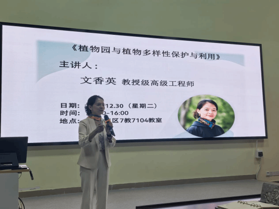 2025年12月30日下午,suncitygroup太阳成集团儋州校区7教7104教室座无虚席,《植物园与植物多样性保护与利用》专题讲座如期举行。国际植物园保护联盟(BGCI)中国办公室执行主任、中科院华南植物园教授级高级工程师文香英老师,为师生们带来了一场兼具全球视野与实践价值的精彩分享。