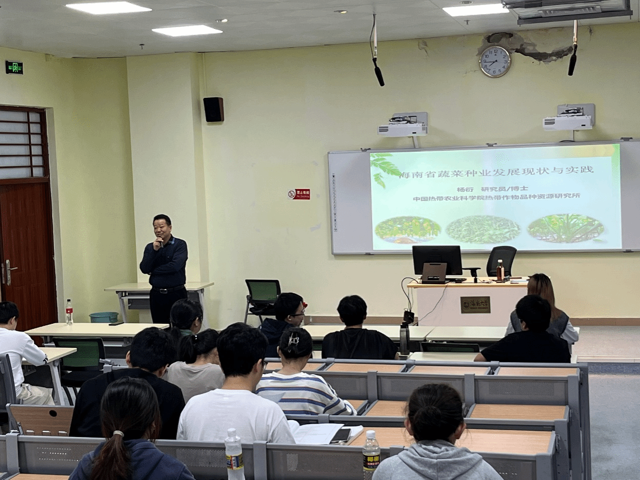 杨衍研究员围绕园艺植物育种在海南的具体应用重点讲述了:(1)海南地区园艺植物育种的特点(2)新品种选育的申报流程(3)园艺植物新品种推广在海南的实践三个方面。杨衍研究员的讲述生动幽默,图文并茂,从自身丰富的工作经历出发,为同学们展示了生动的育种工作实例。杨衍研究员在讲授过程中运用多种手段启发同学思考,同学课堂参与积极性很高,互动不断,课堂学习气氛浓厚,教学效果良好。同学们纷纷表示对杨衍研究员团队研究内容的兴趣,杨衍研究员也欢迎同学们有机会去热科院参观实习。最后课程在同学们热烈的掌声中圆满结束。