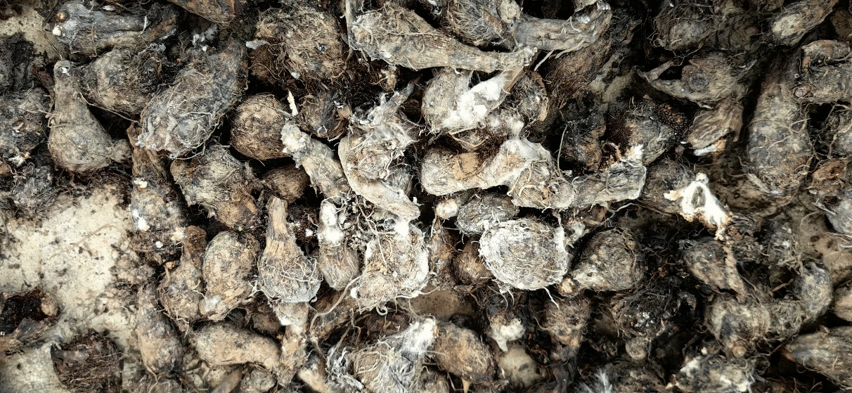 在海口市龙泉镇五一村,救灾小组根据芋头产业发展公司的介绍,对芋头种薯存放的相关区域进行了现场调研。根据现场种薯的发霉情况判断。发生发霉腐烂的芋头种薯主要原因为,感染丝核菌后发生芋头白绢病。尤其在台风过后,种薯贮藏房间不通风,湿度增加,加重了种薯的发病情况。结合生产实际,谢昌平老师现场向公司相关技术人员进行介绍了芋头白绢病的发病规律、侵染机制和防治措施。并针对芋头种薯白绢病的预防,进行编制了后续防控方案。