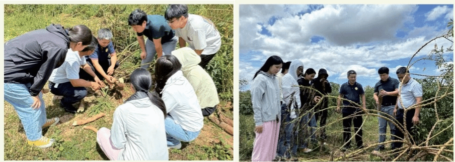 9月12日,东成镇“博士村长”服务团,陈银华教授带领团队王红刚老师、高豫博士、谷田田博士、杨丽云博士、冯亚亭博士、李天宇硕士到东成镇多个木薯地里调研指导灾后木薯生产, 根据木薯地块情况分别提出提前收获、扶正、剪枝和重新种植等 措施。陈教授还指导木薯灾后病虫草害综合防控,提出了灾后防控流程。与欧文军研究员到木薯加工厂了解受灾情况,交流指导。