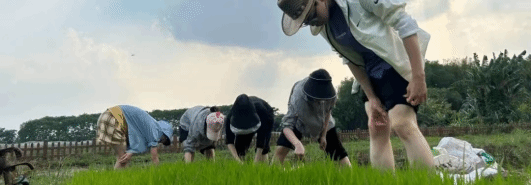 图5 同学们在兰花基地实习 图6 同学们向研学小朋友介绍农耕活动